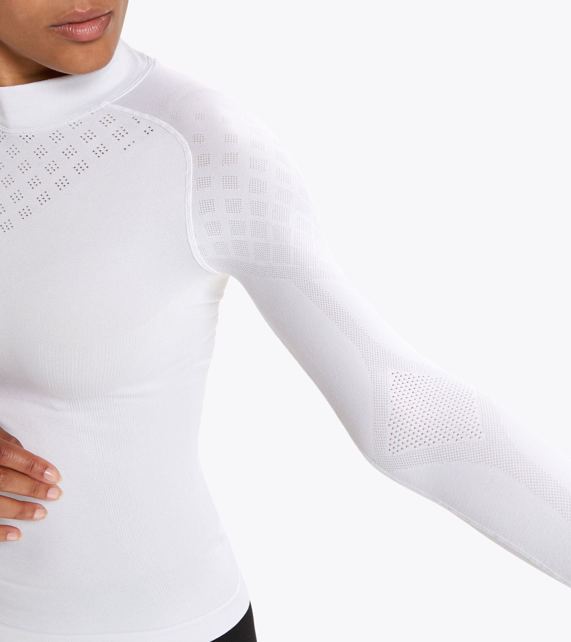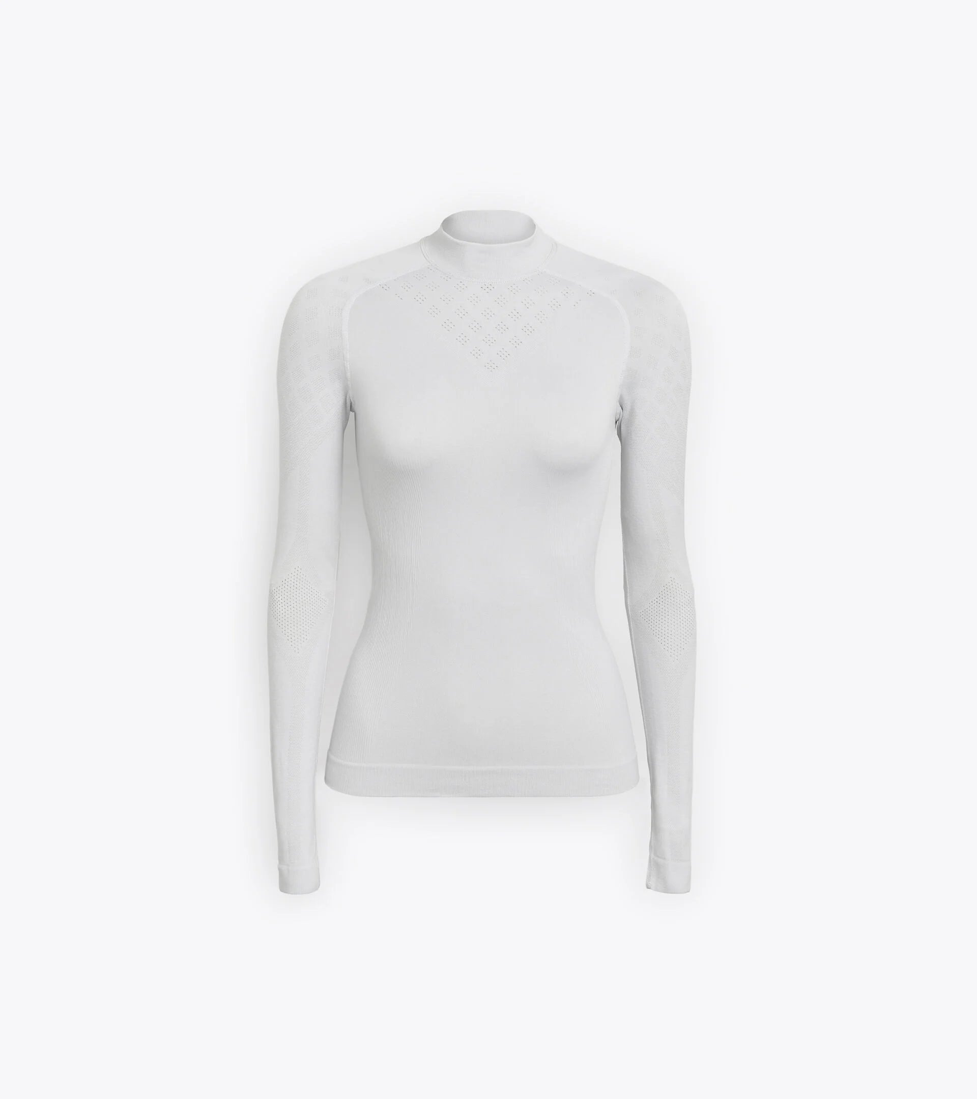 Collo a lupetto, manica lunga in morbida e leggera mischia di poliammide e polipropilene. Quest'ultimo - tono su tono - riveste la duplice funzione di mantenere il corpo asciutto ed evidenziare i loghi. Tecnologia DIA BREATH traspirabilità e leggerezza grazie alla particolore struttura in microfibra e alla conformazione alveare, DIA FIT Libertà di movimento e leggerezza