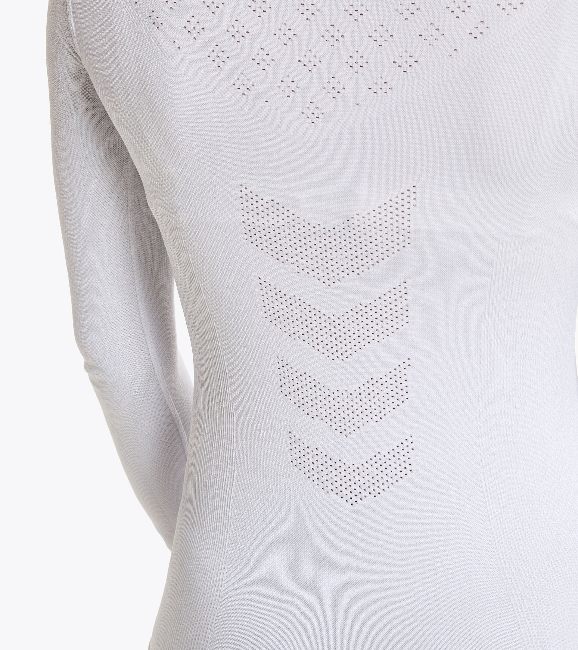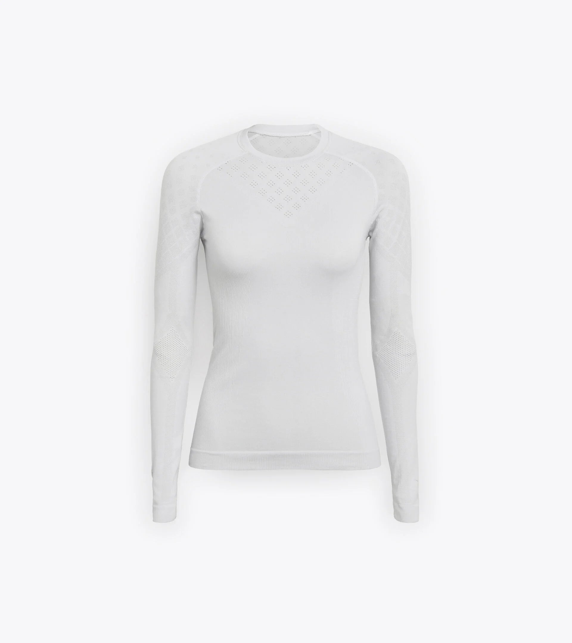 Girocollo, manica lunga in morbida e leggera mischia di poliammide e polipropilene. Quest'ultimo - tono su tono - riveste la duplice funzione di mantenere il corpo asciutto ed evidenziare i loghi. Tecnologia DIA BREATH traspirabilità e leggerezza grazie alla particolore struttura in microfibra e alla conformazione alveare, DIA FIT Libertà di movimento e leggerezza