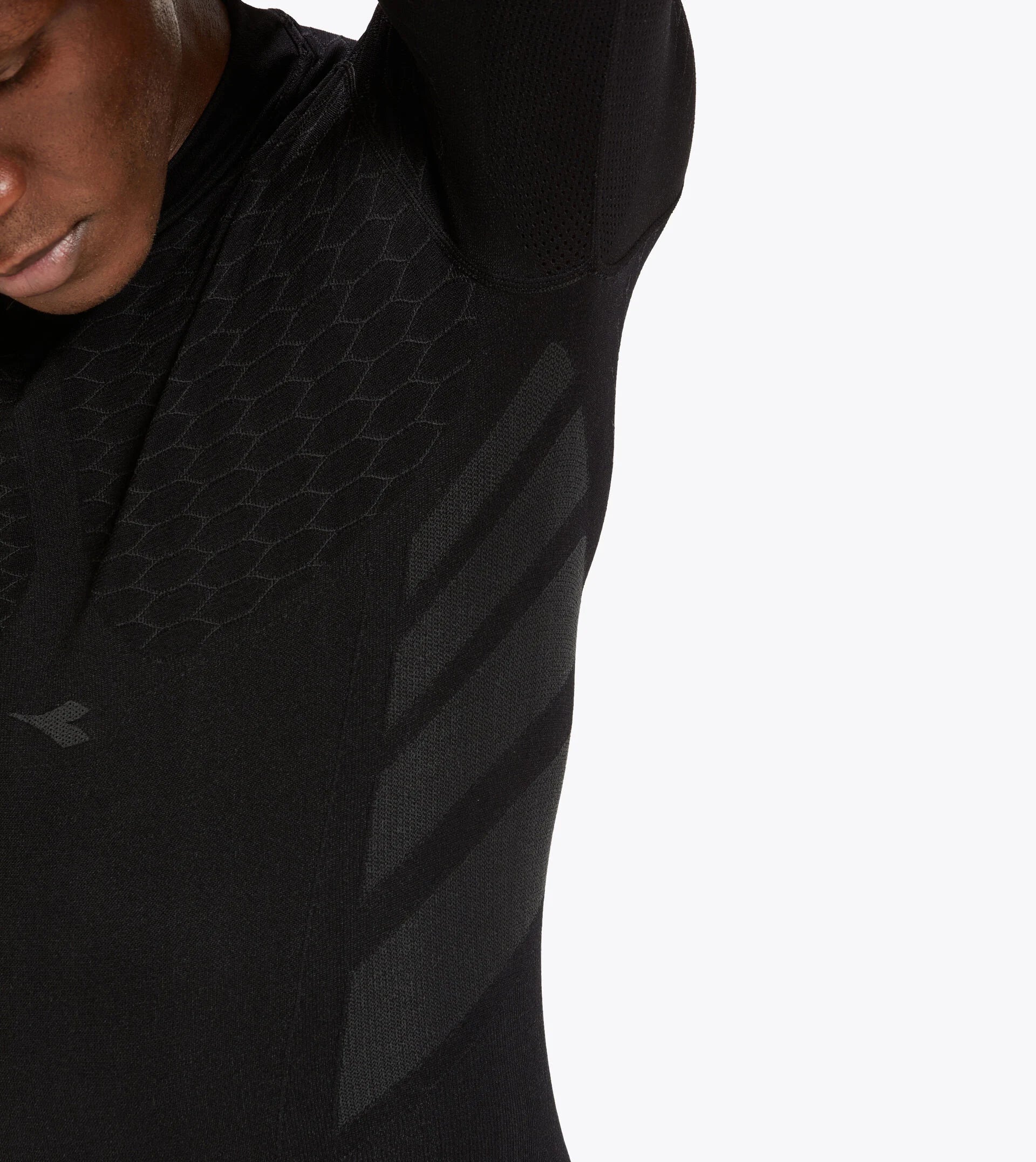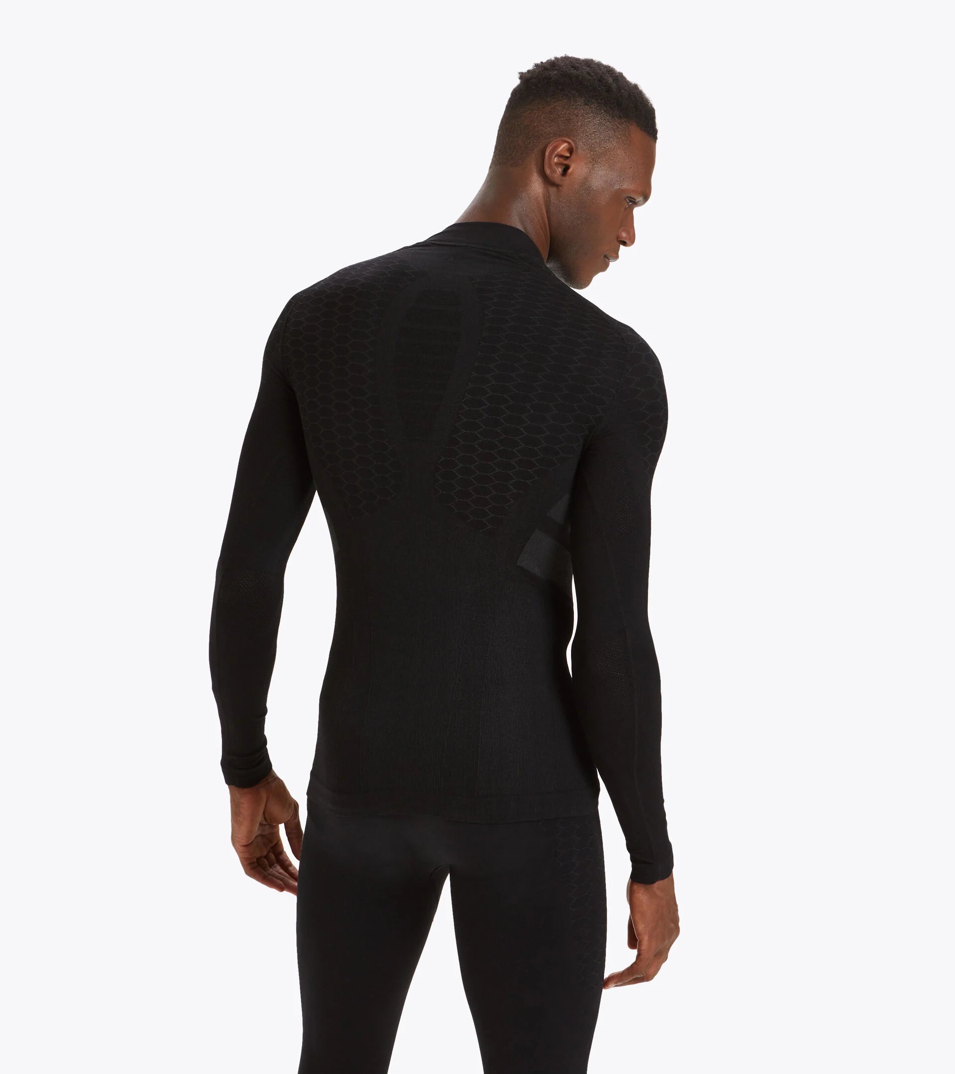 Collo a lupetto, manica lunga in morbida e leggera mischia di poliammide e polipropilene. Quest'ultimo - tono su tono - riveste la duplice funzione di mantenere il corpo asciutto ed evidenziare i loghi. Tecnologia DIA BREATH traspirabilità e leggerezza grazie alla particolore struttura in microfibra e alla conformazione alveare, DIA FIT Libertà di movimento e leggerezza