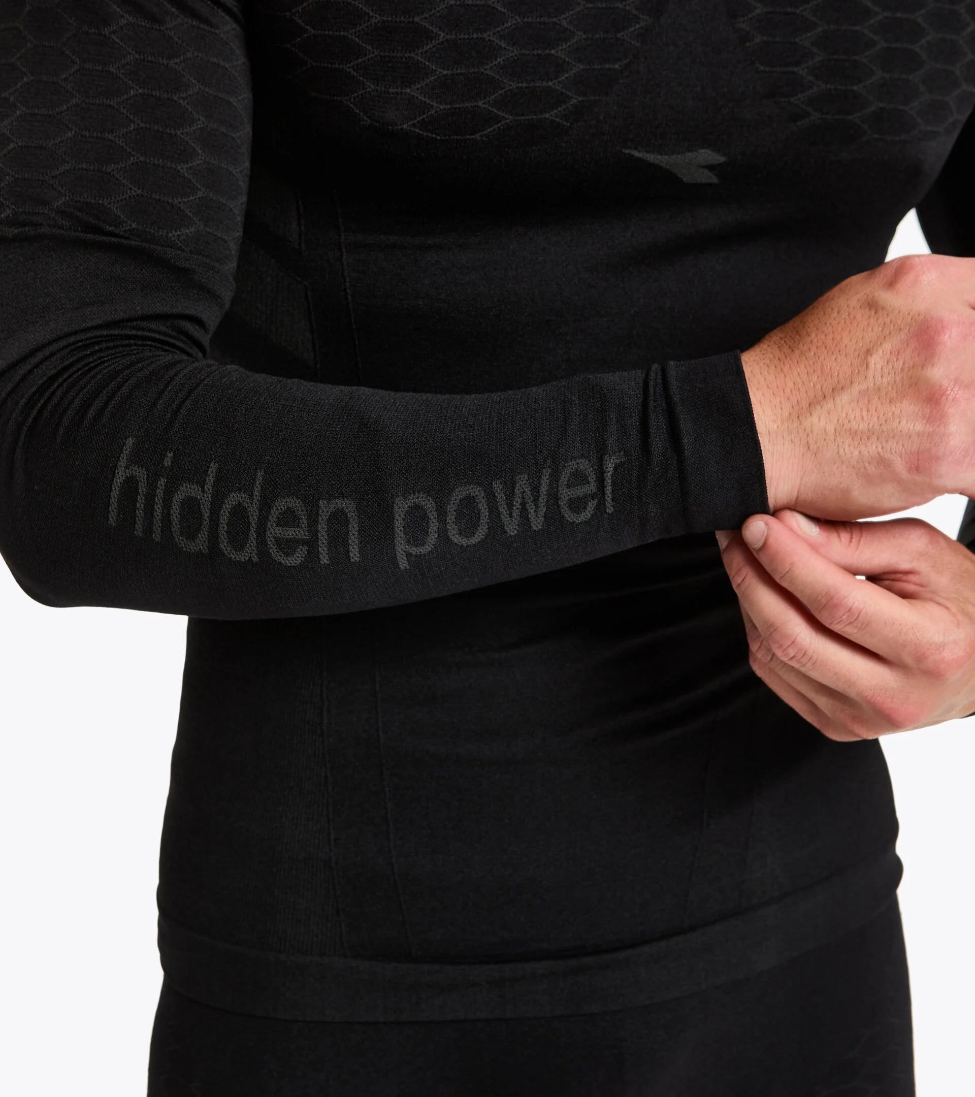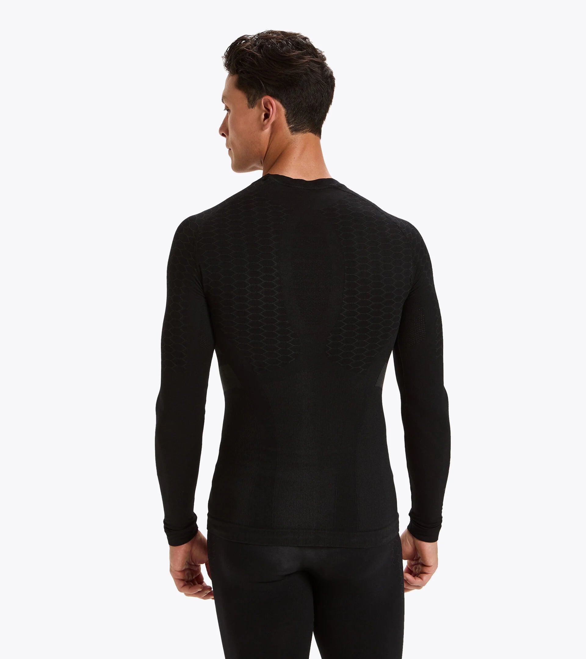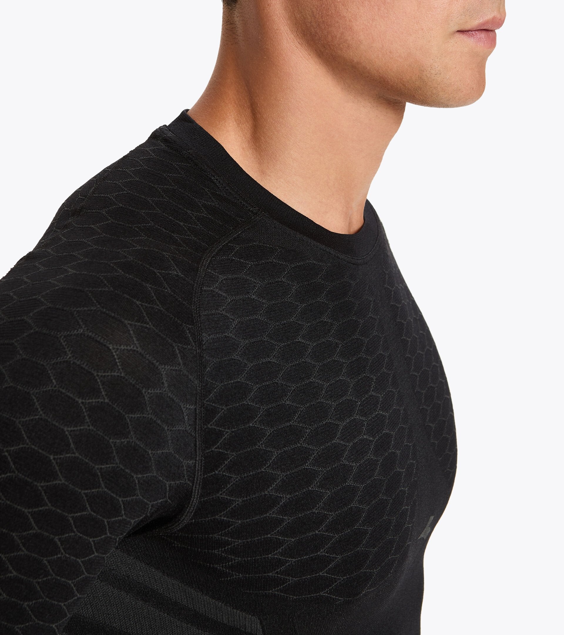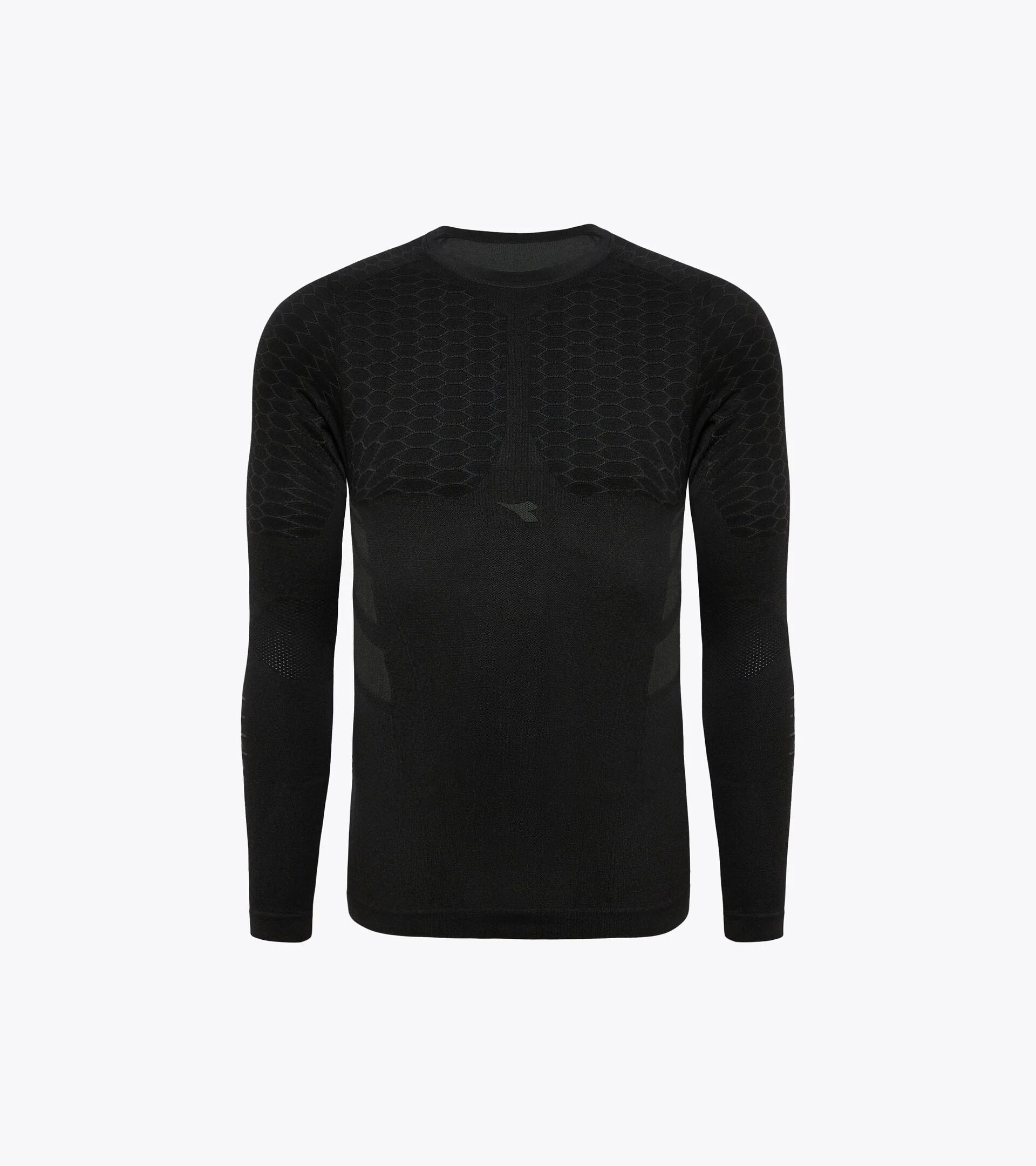 Girocollo, manica lunga in morbida e leggera mischia di poliammide e polipropilene. Quest'ultimo - tono su tono - riveste la duplice funzione di mantenere il corpo asciutto ed evidenziare i loghi. Tecnologia DIA BREATH traspirabilità e leggerezza grazie alla particolore struttura in microfibra e alla conformazione alveare, DIA FIT Libertà di movimento e leggerezza