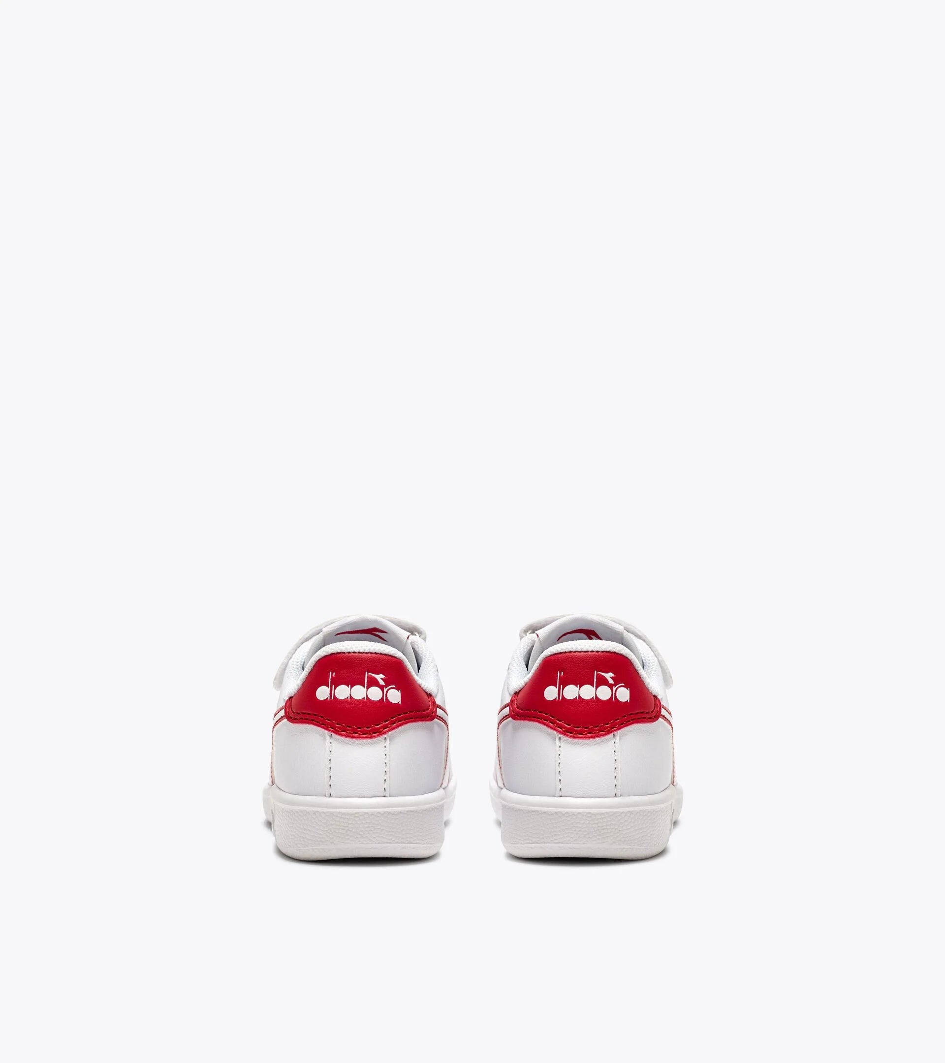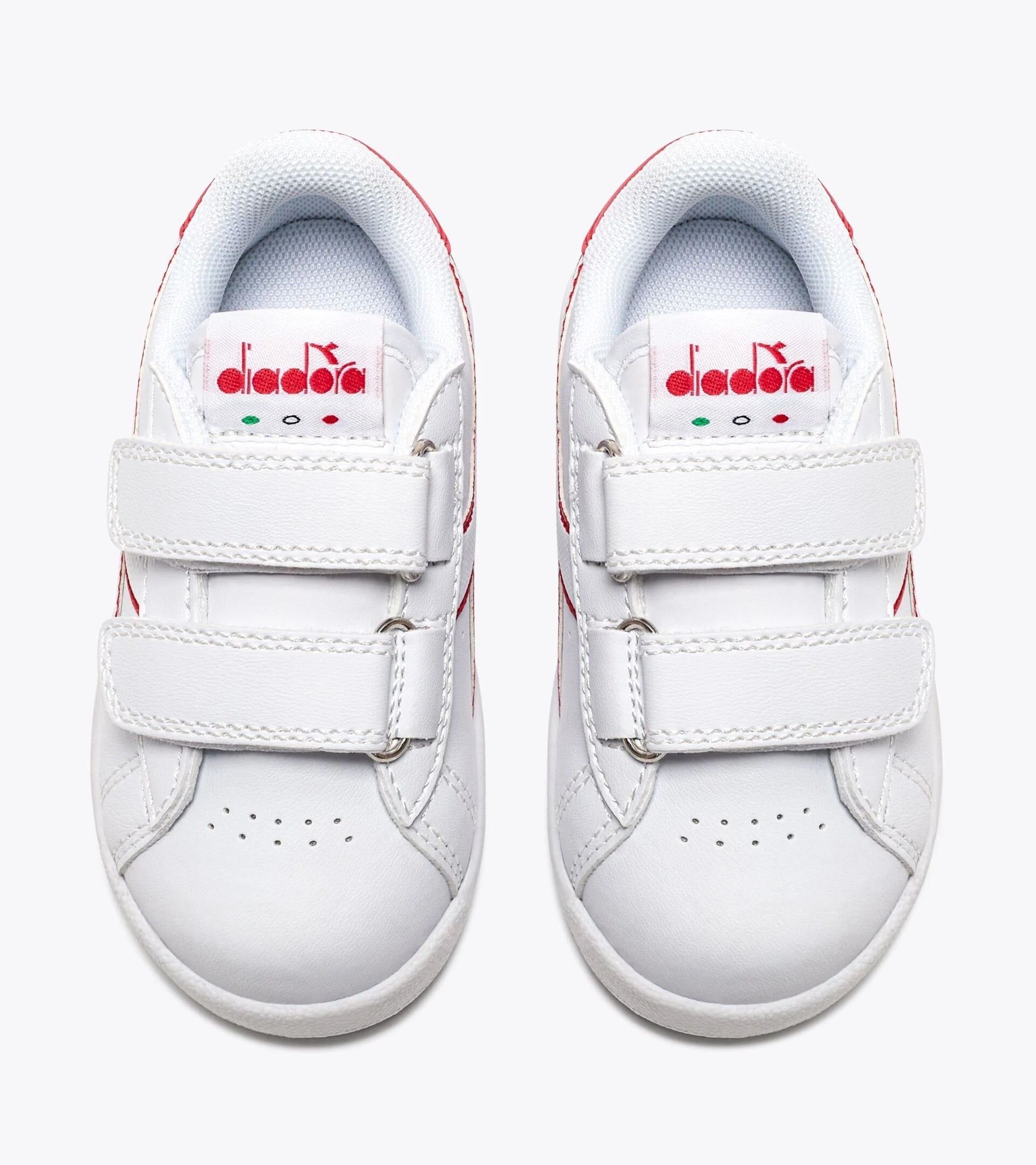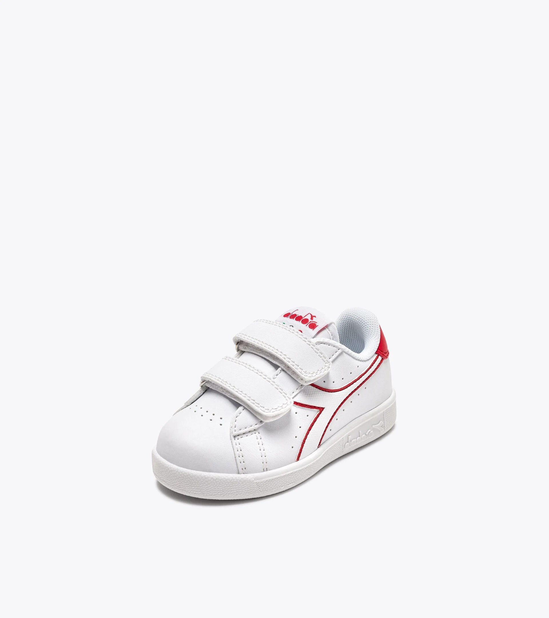 Sneaker per bimbi low cut, dettagli traforati, pratica chiusura a strappo, fregio, linguetta e back abbinati.